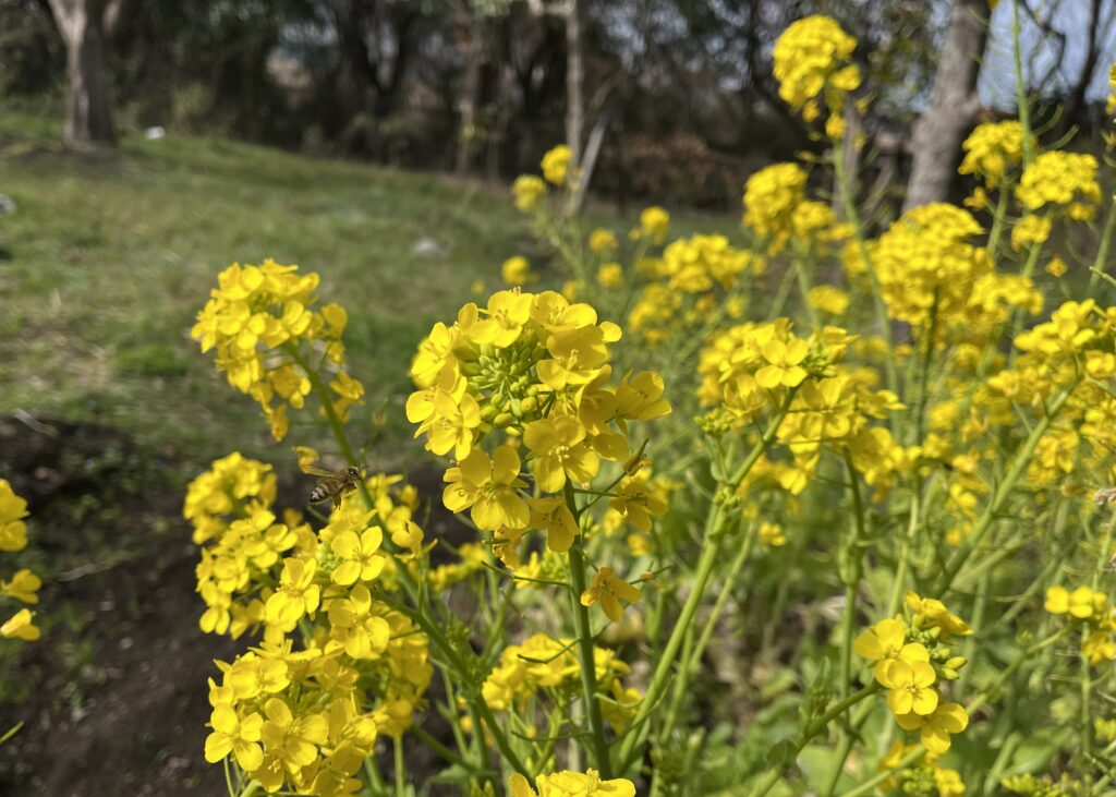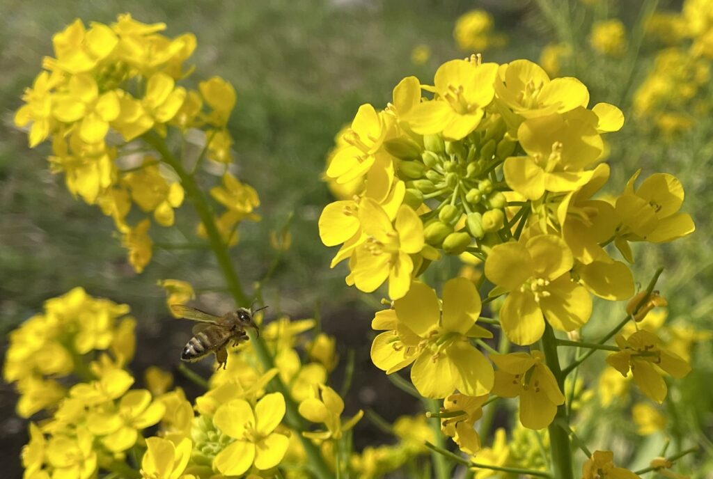 畑の菜の花ではニホンミツバチがせっせと花粉を集めていました。